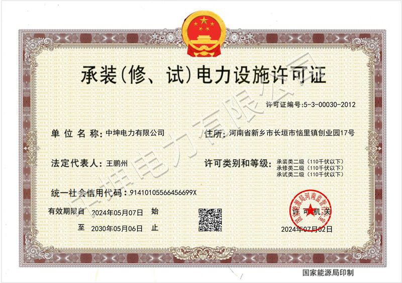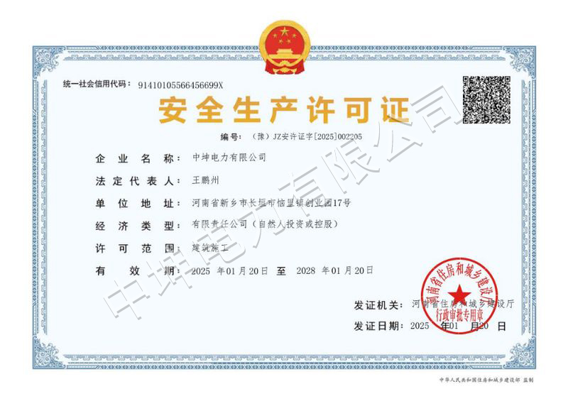 施工机具300余种中坤电力有限公司(曾用名:郑州中坤电力有限公司)成立于2010年12月02日,注册资本1.7亿元,公司现有办公面积1500平方米,仓库面积5000平方米,总部位于长垣市山海大道,在郑州市高新区、荥阳市和湖北设有办事处,是一家集电力、安装、建筑、能源、环保、市政等为一体的现代化施工企业。公司有员工350余人,有丰富的实践经验,拥有防水防腐保温工程承包壹级资质,承装(修、试)电力设施叁级许可资质,并拥有输变电承包、消防设施工程承包、建筑装修装饰工程承包贰级资质,建筑工程施工总承包、电力工程施工总承包、石油化工工程施工总承包、市政公用工程施工总承包、机电工程施工总承包、地基基础工程承包、建筑机电安装工程承包、环保工程承包叁级资质,施工劳务不分等级、模板脚手架承包等多项施工资质。我们主要从事各类大中型发电工程、各种电压等级的输变电工程(110千伏及以下输电线路、变电站)的业务,以及机组安装调试维护、电力设施安装调试维修、工业与民用建筑、设备安装、市政设施管理、水利、能源化工、钢结构、环保、技术咨询等业务,市场业务分布全国各省。公司施工机械设备实力雄厚,拥有大中型起重设备与吊装队伍,并拥有各类**的工程机具300余种。